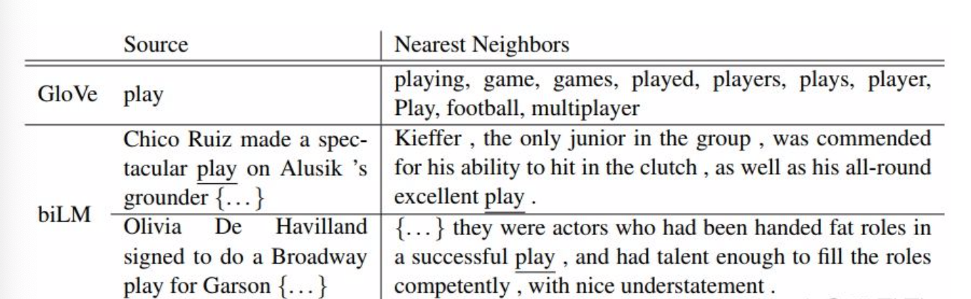 上图中的例子, 对于GloVe训练出来的word embedding来说, 多义词比如play, 根据它的embedding找出最接近其语义的单词, 发现结果集合几乎全部都在体育领域, 这很明显是因为训练数据中包含play的语句中体育领域的数量明显占多数导致的.
