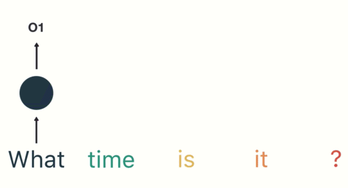 - 第三步: 继续将单词"time"输送给RNN, 但此时RNN不仅仅利用"time"来产生输出O2, 还会使用来自上一层隐层输出O1作为输入信息.